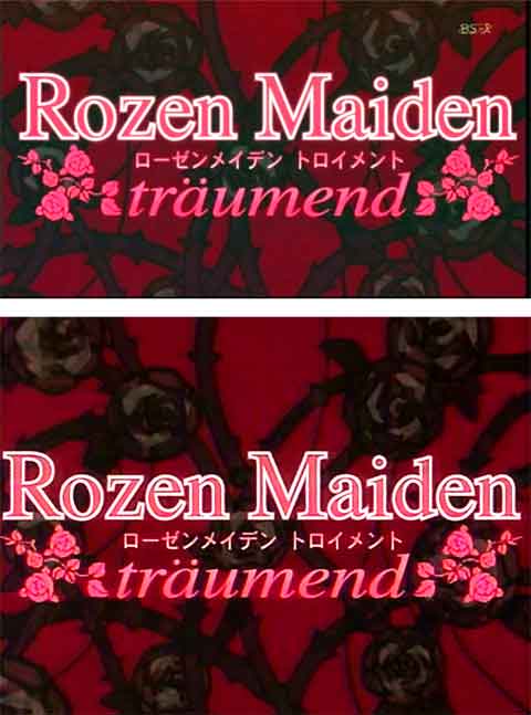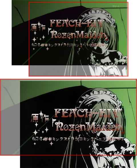 | ローゼンメイデン トロイメントが始まりました。 今のところ、TBS地上波とBS-iのみで第1話が放送終了のはず。 で、これなんですが、TBS地上波は4:3で放送、 BS-iは16:9で放送なんです。 普通の映画とかは、16:9の物を4:3で放送するときは、 両端を切って放送するものだと思ってたのですが・・・・・・。 この二つを比べてみると、何と何と何と!!!!! ちなみに、BS-i版は日本全国どこでも見れるので問題ないが、 TBS地上波版は、一部地域しか見れません。 ですが、同じ(と思われる物)は下記で見れます。期間限定ですけど。 アニメイトTV WEB -Webアニメシアター- でも、正直なところ、私はTBS版を知り合いに送ってもらいました。 ブロードバンドって便利だ・・・・・。ま、ホントはマズいんですけどね・・・。 で、まず検証1 アニメイトTV版とTBS地上波版は同じか? ![]() 上がTBS地上波版、下がアニメイトTV配信版です。 ちなみに、わかりやすくするためにかなり明るさとかをいじってあります。 アニメイト版は30fpsじゃないので、上と数フレームの誤差がでてるのですが まあ同じだと思われます。 というわけで、解像度と編集性の都合により、地上波版とBS版で検証。 同じシーンを出してみます。 ちなみに、これは、ローゼンのロゴが最初に画面内に入った瞬間のフレームです。 (元の動画見れば何を言いたいのかわかるはず) ![]() ロゴとサイズでわかりますが、上がBS版です。 一瞬、BS版は上下切って放送してる??? と、思いますが、よーーーーーく見てください。 ローゼンのロゴと背景の薔薇の重ね合わせを見ると、 BS版と地上波版で別に作っていて、単純に切っているわけじゃない事がわかります。 ええ、BS版と地上波版で別にOP作ってるんですよ。 なにも、OPロゴに限った事ではありません。 ![]() 見えてる範囲をわかりやすいように重ねてみました。 まず、テロップが被ってる位置が違いますよね。 あと、BS版は左上の方が多く見えてますが、地上波版は若干右側がBS版より多く、 下が多く見えてますね。 と言うように、単純にTV局が切り落としてるだけではなく、 明らかにBS版と地上波版(ワイド版とノーマル版と言った方がいいかな?)で、 元ソースが違うという訳です。 まぁ、今時のアニメなんてどうせデジペでしょうから、切り出しとテロップなんて、 若干の修正でできるとは思いますけどね。 では、OPは作り直してるとして、本編はどうなってるのか? というと、これも全部見比べた訳じゃないですが、 これはどうやら元ソースは同じで、放送時にトリミングしているだけのようです。 ただ、地上波版も単純に左右を切り落としてるわけではなく、 シーン毎にどこを切り出すか(中央、左端、右端等のように)が変わっています。 これはこれでまた手間がかかってる・・・・・? ちなみに、DVDはワイド版で発売予定。 と言う事は、(特にOPは)放送したにもかかわらず、DVDには収録されない部分があるという事です。 指6本だったのがいつの間にか5本に修正されているとかそういう問題じゃなく、 せっかく絵が描かれてるにもかかわらずDVDには収録されないんです。ああ勿体ない。 映像特典で両方版のOPとか入ったら偉いな。。。。。 ところで、だ。 地震速報! 邪魔。 せっかくのハイビジョン放送になんてことしてくれる。 そんなのこそデータ放送でやれよ・・・・・。 |