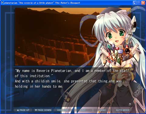 | すんげーもの発見。 planetarian 英語化パッチ ![]() こんなかんじ。 ちなみに、テキストだけでなく、CGもきちっと書き直してあるという手の込みよう。 たとえば、ゆめみのネームプレートとか。 ところで、訳の品質はどんなもんだろうね。私も英語はよく分からないので偉そうな事は言えないんだけども。 でも、もしかするとネタバレ的話題を含むんで、一応反転しておこうか。 (選択するとつづき読めます)。 まずサブタイトルとか「ちいさなほしのゆめ」が「the reverie of a little planet」ってなってる。 これは、「『ちいさなほし』のゆめ」。本物は、どこで切れるんだろうねぇ。「『ちいさな』ほしのゆめ」なのかもしれない。両方をかけてるのかもしれない。 「ちいさなほしのゆめ」は「ゆめみの願い」を示してる気がするんだけど、違うかな? とすると、「『ちいさな』ほしのゆめ」は、「ゆめみのささやかなたった一つの願いは・・・・」という意味だろうし、 同じ解釈でも、「『ちいさなほし』のゆめ」だと、「プラネタリウムを見せてくれるゆめみ」が「ちいさなほし」という解釈もできるかもしれない。 あー、原文を解釈できないのに英語にケチをつけるな、ってか。ごもっともで。 とか、決めゼリフ(?)。 「プラネタリウムはいかがでしょう。~満点の星々がみなさまをお待ちしています。」とか。 → 「What do you think about the planetarium? That beautiful twinkling of eternity that will never fade,no matter when. All the stars in all the sky are waiting for you.」 って、訳されてる。 ・・・・やっぱり違うんじゃね?特に1行目とか、これだと「planetariumについてどう思いますか?」だろうし。 いや、じゃあどう訳すといわれるとこまるが・・・・。いやだから私は英語力なんてないから。せいぜいちょっと読める位だから。ほとんど書けないから。 とか、上のスナップショットだと。 「『当館解説員の、ほしのゆめみと申します』 子供じみたほほえみと一緒に、手に持ったなにかをこちらに差し出してくる。」 が、原文だけど、まず名前変わってるんだよね。Reverie Planetarianって。まあ名前は難しい問題だろうけど。 「ほしのゆめみ」っていう名前はどんな由来があるんだろう(応募で決まったとかっていうのはナシで)。 「プラネタリウム(ほし)で夢を見せてくれる」とか「ほしの夢を見るロボット」とか、そんなのだろうなあ。 まぁこれはどうしようもないか。 (ネタバレここまで) |