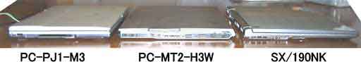 突然だけれども私の持ってるノート。![]() 並び順は発売日順。 PC-PJ1-M3 1998年11月発売 (以下旧メビ) PC-MT2-H3W 2002年11月発売 (以下ムラマサ) dynabook SS SX 2005年4月発売 (以下dynabook) 見ての通り基本的に薄型が好き。ノートなんだから持ち運びに便利じゃないと。 3Dがサクサク動くスペックなんて要らない、光学ドライブなんていらない。 ちなみに、旧メビはジャンクかき集めで作成。他2台は発売してすぐにまともに購入。 これはどれも、当時は薄型を売りにしてたノートなんだけど、 さて、実際にこの3つで一番薄いのはどれでしょう??? ちなみに、写真を見ても、大差がないは一目瞭然かと。 (以下、メーカー公称スペック)