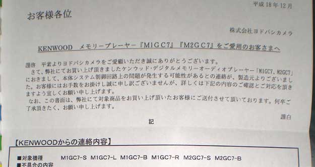 | 先日買ったKENWOODのM2GC7。音飛びがする、というのも先日書いたんだが、 これが、見事、リコールがかかった。 フリーダイヤル受付時間 月曜日~金曜日 (土・日・祝祭日・弊社休日を除く) 9:30 ~ 18:00 サービスセンター受付時間 受付時間: 月曜日~金曜日 (土・日・祝祭日・弊社休日を除く) 10:00 ~ 18:00 という、普通に働いてる人をナメてる時間なわけだ。いつ連絡しろってな。 で、困ったときは販売店へ。そんな時のヨドバシ。 私:「こんなリコールが出てるんだけど、連絡できる時間じゃないから対策品と交換してくれない?」 ヨ:「確認しますのでしばらくお待ち下さい」 ・ ・ ・ ・ で、ちょっと(数分)待たされましたけど、交換してくれました。さすがヨドバシ。偉い。 たぶん、ヨドバシからKENWOODには、「おまえらが受付さぼってるからこっちに降ってきたじゃねーか」と クレームが行くんだろうけど、そんなことは知った事じゃない。 ヨドバシのアフターが悪いとかいう人もいるけども、あの店は確実に顧客優先の対応をしてくれます。 確かに、製品の使い方とかのサポートとかはたぶんしてくれない。 でも、販売量がかなり多いから、メーカーに対してかなり強い立場で物を言える店なんです。 だから、メーカーとユーザーの橋渡しというサポートに対しては、非常に強い味方になってくれます。 製品の使い方とかのサポートをして欲しい人は、もっと違う店で買うべきでしょうけどね。 ところで、交換って、新品交換じゃなく、本当に本体だけを交換してくれた。 付属品、箱とかは元のまま。まぁ、本体は新品になったんだけど。 箱と本体のシリアルが違うという事に。 ま、保証書にはシリアル入ってないから修理とかも問題でないから、どっちでもいいんだけどさ。 |
