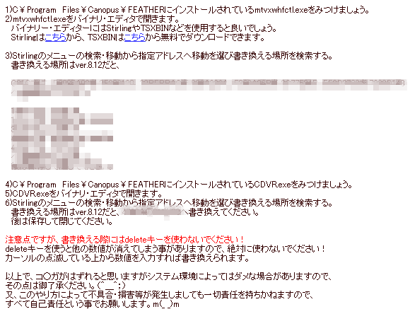 とある場所でこんなものが。![]() ちなみに、モザイクかかってるところはウチのHPに書いてるのと一緒。 ・・・・・じゃ、モザイクかける必要も無いんだがな。 まぁ・・・・、2chじゃないだけいいか。 レスった人は愉快犯だね。 そういやあ、SHF+FEATHER2006とかいうのをそのうち、とかいって公開してなかった気がする。 2006(ver9.03)を解析してて気付いたんだが、「CDVRMXUSB.dll」というファイルを書き換えると、 もしかすると機種依存しないで暗号化を回避できるかも。 まぁ、それだけだと、マクロとかノーモアは録画できないんだけども。 暗号化されたm2dを見ると、頭にRIFFヘッダが付いてるのが解ると思う。 CDVRMXUSB.dllの中で、RIFFヘッダを作っているところを見つければ、 逆アセンブラ読める人ならそんなに難しくないんじゃないかな・・・・? ちなみに、自己書き換えチェックとかは無いよ。 マクロとかノーモアを撮ろうとすると、「mtvxshfctl.exe」の書き換えが必要。 これはおそらくどう頑張っても機種依存するのではないかと。 というわけで、公開はもうしばらく待たれよ。 で、何故そこで引っ張るかって? えー、結局、SHFをまだ実用で使ってないんで、 「ノーモアが本当に完全に外れてるのかがぁゃιぃ」からです(笑) ノーモアを頻繁に撮るような人で、我こそは人柱にって人が居ましたら、こっそり教えますよ~。 動かないかもしれないけどね(笑)。 まぁ、SHFの検証するためには、まず電源なんとかしないとキャプチャ中めっちゃ不安定なんだよ(泣)。 ・・・そうそう、電源と言えば、 VGA用補助電源がThermaltakeから、5インチベイに設置 ってものを発見。 うんうん、これをやりたいのですよ。ただ、やりたいのはVGA用じゃなくHDD用だけどね。 みんな、似たようなことを考えるのね。 作ると+30W程度で\3k弱。適当な場所に組み付けれるのでベイはたぶん埋まらない。 これ買うと+250Wで\8k。でもベイが埋まる。 Shutttleの純正(?)で交換すると、+50Wで\10k。ただしスペースに有利=冷却に有利。 ちなみに、あの箱の中で250Wを消費、しかも大半が熱になるんだから、結構な熱量。 だから、あんまり、箱の中をぎっちりにしたくは無いってのもあり。 さて、どれが本当にお得かねぇ。 |