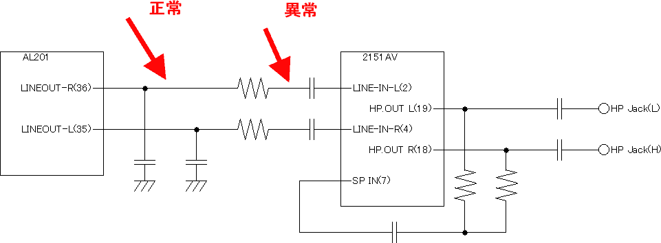 | さて、メビウスがまた壊れたという件。 症状としては、「音が出なくなる」。 もうちょっと詳しく言うと、音がでてて、そのうち出なくなる。 数秒で復帰することもあれば、ずっと出なくなることもある。 音が切れるときと復活するときに、「ザザッ」というノイズが出ることもある。 スピーカー、ヘッドホン共に発生。 とりあえず、開けて調べてみました。 ![]() まず、怪しきはこのオーディオボード。 写真左上の正方形なのが、オーディオチップ。REALTEKのALC201。 真ん中のがアンプ。JRCのNJM2151AV。 とりあえず、オーディオチップのDA出力からは、正常な信号が出ている模様。 ちなみに、このアンプICはヘッドホンどスピーカー入力は別系統の独立構成。でも、 でも、スピーカー、ヘッドホンともに症状は発生。アンプの入力段階で信号が変。 というわけで、回路を追っかけて見たところこんな感じ。 多層基板だから単純にこれだけの回路だ、っていうのが解るまでが一苦労。 ![]() AL201のモノラル出力は使用してない模様。 AL201の出力では、DCオフセットの乗ったオーディオ信号が正常に出ていて、スピーカーから音がとぎれた時も問題はない。 で、2151AVの入力端子では、音がとぎれる時には振幅が異常に大きくなるという現象になっていた。 DCカット用のコンデンサーの手前でも同様。 とすると、直列に抵抗が入っているんだから、2151AVの入力インピーダンスが異常に大きくなったと考えるのがよろしそう。 半導体の故障か・・・・・。 CRとかなら適当に手持ちで何とかなりそうだけど、さすがにこんなの手持ち無いしな。 単なるアンプじゃなく、ボリューム制御とかもしてるから、さくっと適当なアンプ載せ替えって訳にもいかなそう。 まぁ、シャープのサービスに頼めば、部品は出るような気はするが・・・・。 大体、前回まったく同じ症状で修理に出したときには、ボード交換されてたっぽいから、部品単品じゃでないかもねぇ。 まず、そもそも、もうあそこのサービスにはお世話になりたくないんだが。 でもJRCの汎用品だし、手にはいるかな? あともう一個開けて気付いたところ。 ![]() ![]() なんか、閉じたときにキーボードを下げる機構のパーツが歪んでる・・・・。 |